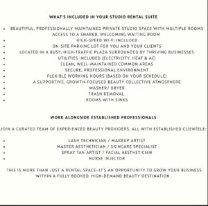 ExpandSuite rental , rent by day or month. Furnished esthetic room, parking,, kitchen, waiting room and conference room. Please text or email.